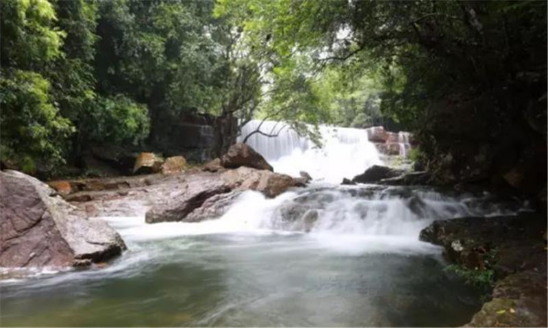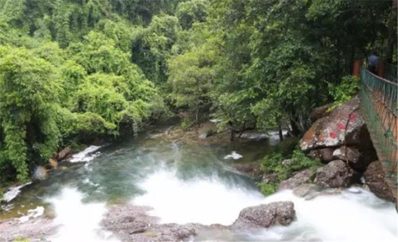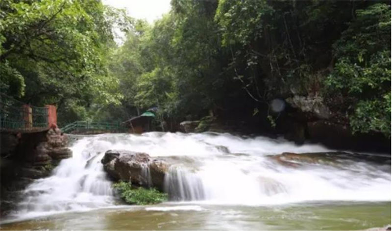 新月潭瀑布,猶如刀削一樣的從絕壁上沖天而下,周邊是成片石板,形如一彎新月,每當雨后清風佛過潭面,水波沿著弧形月亮圈圈蕩漾開來。