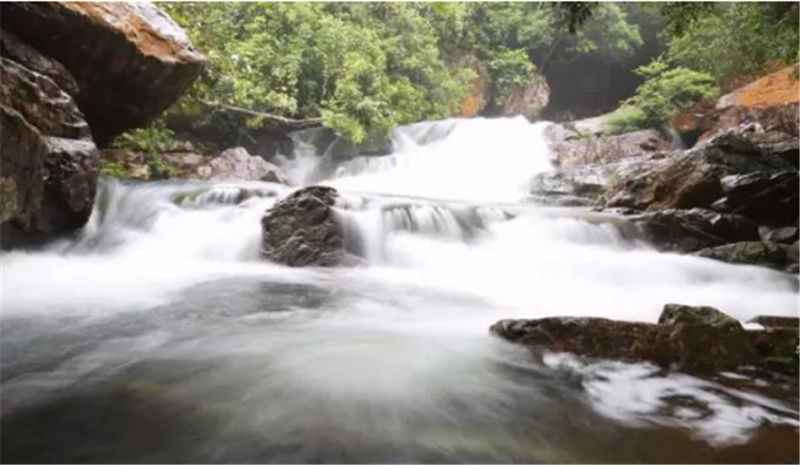 仙女池瀑布,一源兩流的巨大水流從高空落入谷底,在遠處就能聽到振聾發(fā)聵的聲音,像萬馬奔騰從天上來,氣勢恢弘。