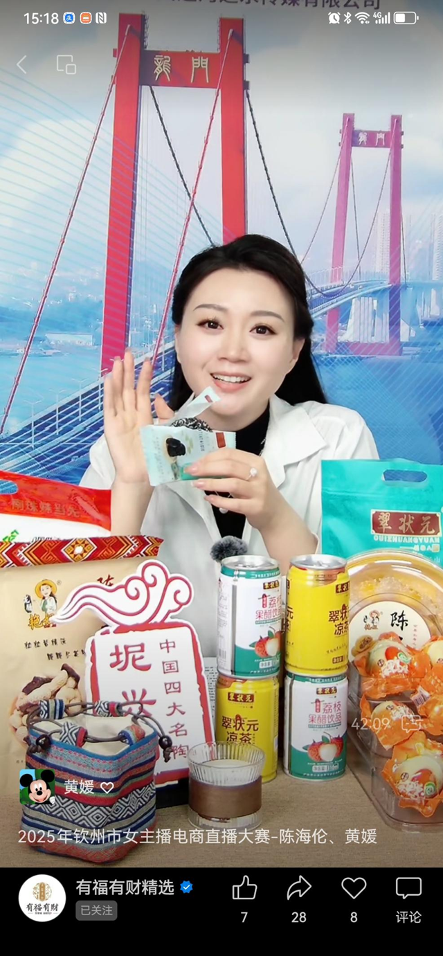 比賽采使用欽州市融媒體中心官方賬號“有福有財精選”在規(guī)定的1.5小時內(nèi)進行直播帶貨。期間,參賽者需自行策劃直播流程、設計話術(shù)、與觀眾互動等。比賽主要考察參賽者的主題把握、內(nèi)容創(chuàng)新、直播節(jié)奏掌控及帶貨能力等。在此次比賽中,陳海倫與黃媛充分展現(xiàn)出精湛實力,憑借精彩發(fā)揮與卓越表現(xiàn)一路過關(guān)斬將。在她們比賽直播期間,集團公司全體員工懷著高漲的熱情,紛紛涌入直播間,大家積極發(fā)送彈幕為她們加油鼓勁,點贊助力,滿屏的支持與鼓勵營造出熱烈氛圍。最終,在全體員工的殷切期盼與加油聲中,陳海倫與黃媛不負眾望,成功斬獲個人賽二等獎的優(yōu)異成績 。