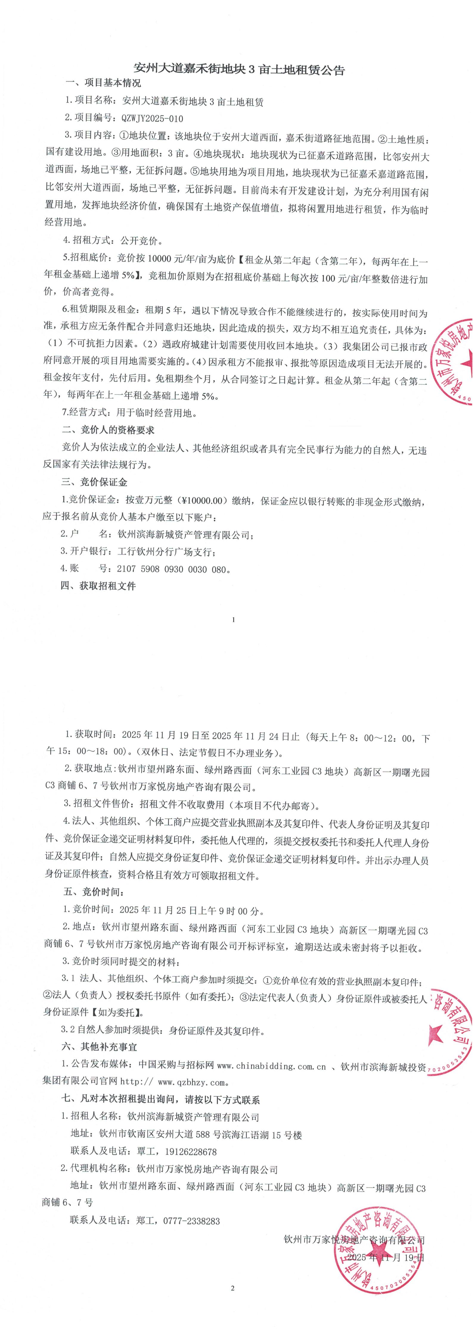 北部灣大學(xué)西門28畝土地作為經(jīng)營(yíng)場(chǎng)地租賃(QZWJY2025-009)成交結(jié)果公告