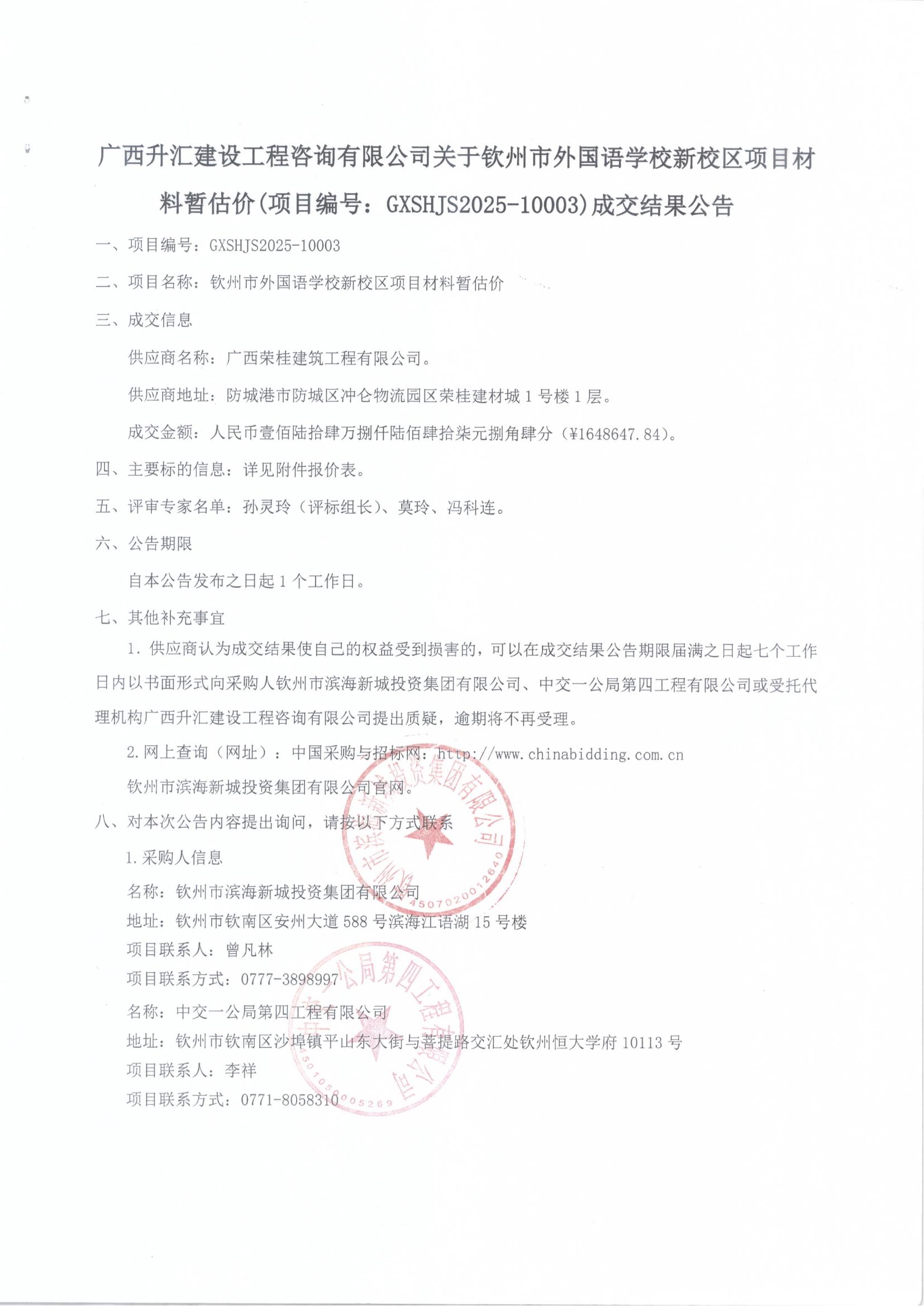 成交結果公告(欽州市外國語學校新校區(qū)項目材料暫估價)