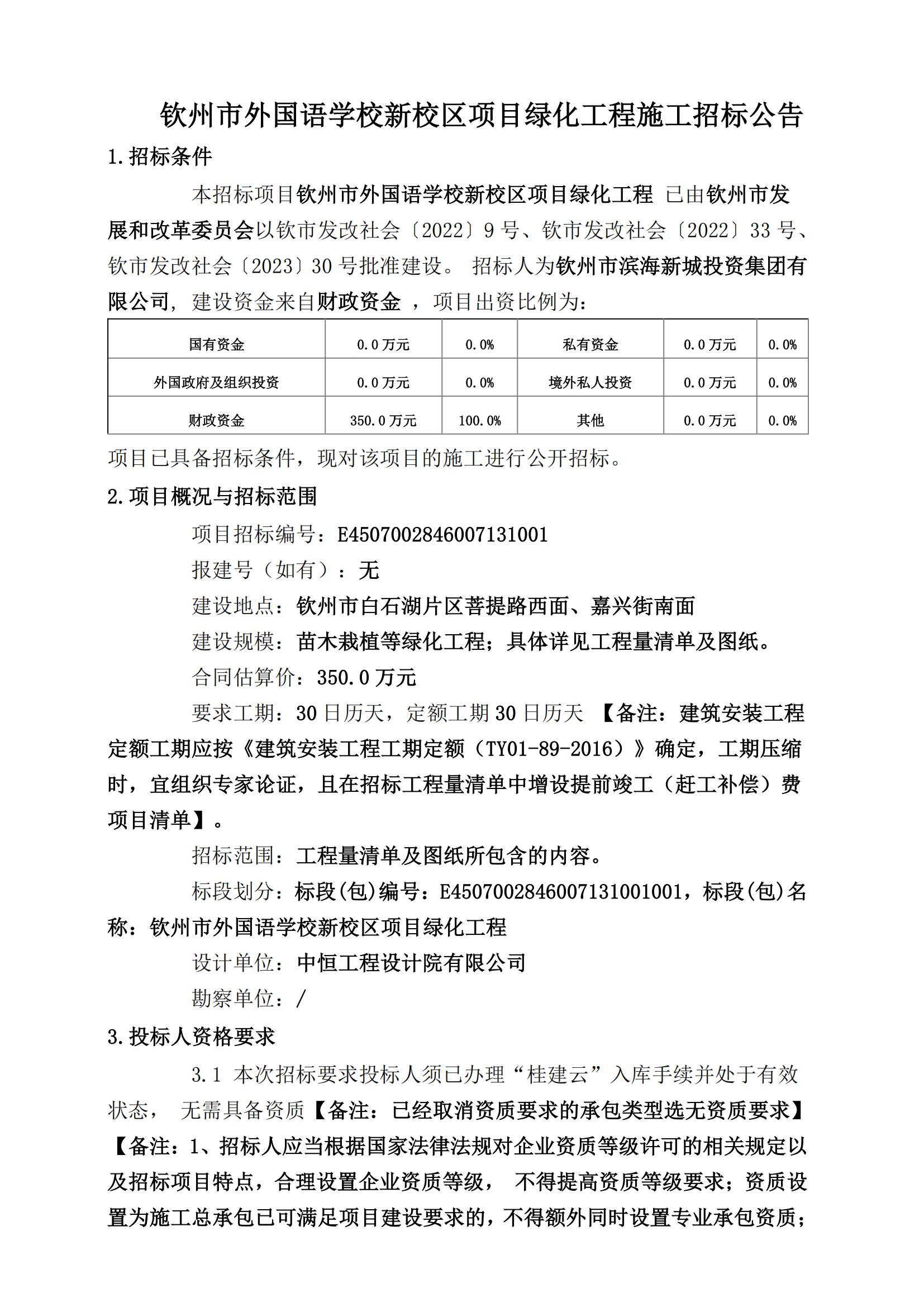 欽州市外國語學校新校區(qū)項目綠化工程施工招標公告