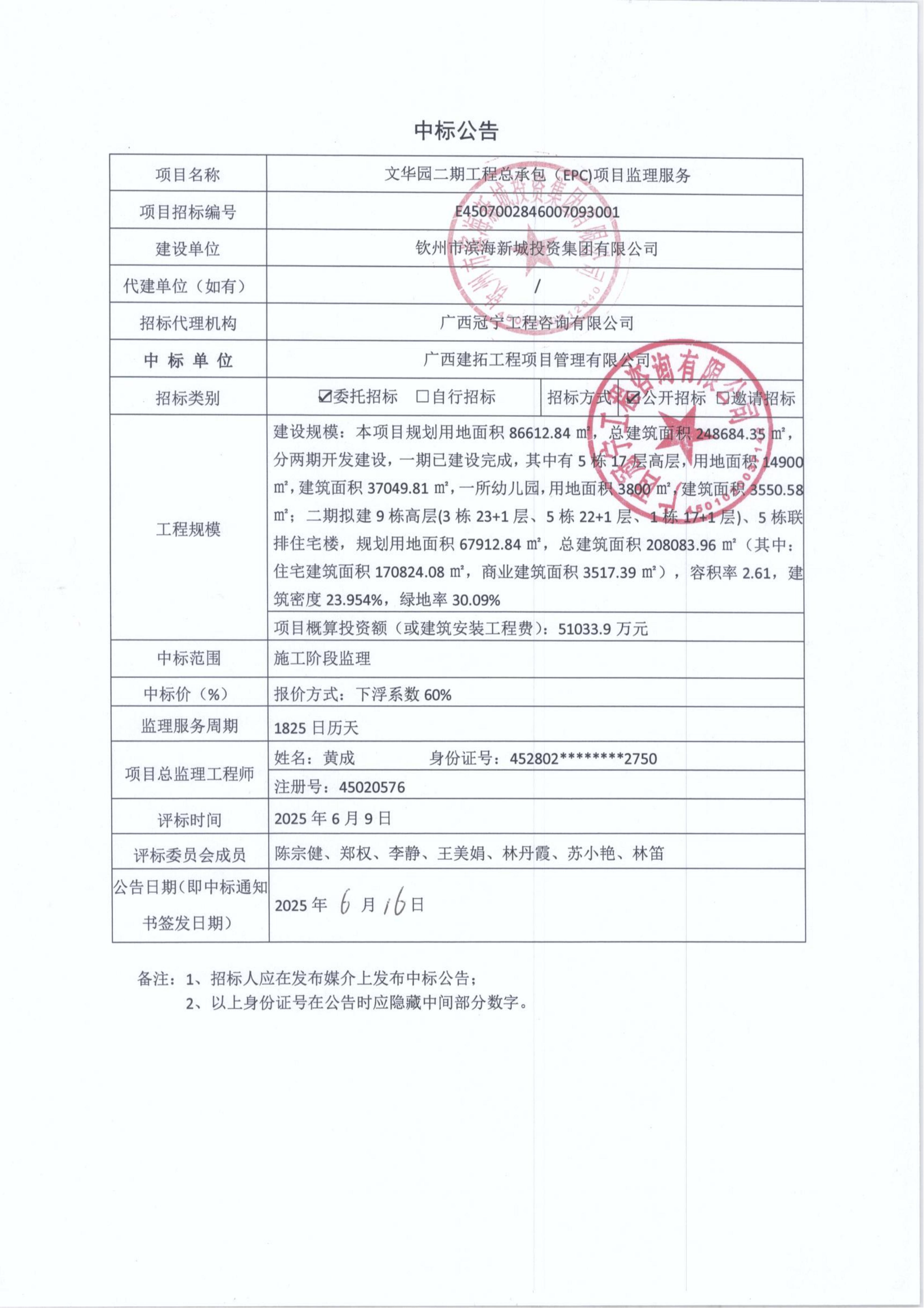 中標公告文華園二期工程總承包(EPC)項目監(jiān)理服務