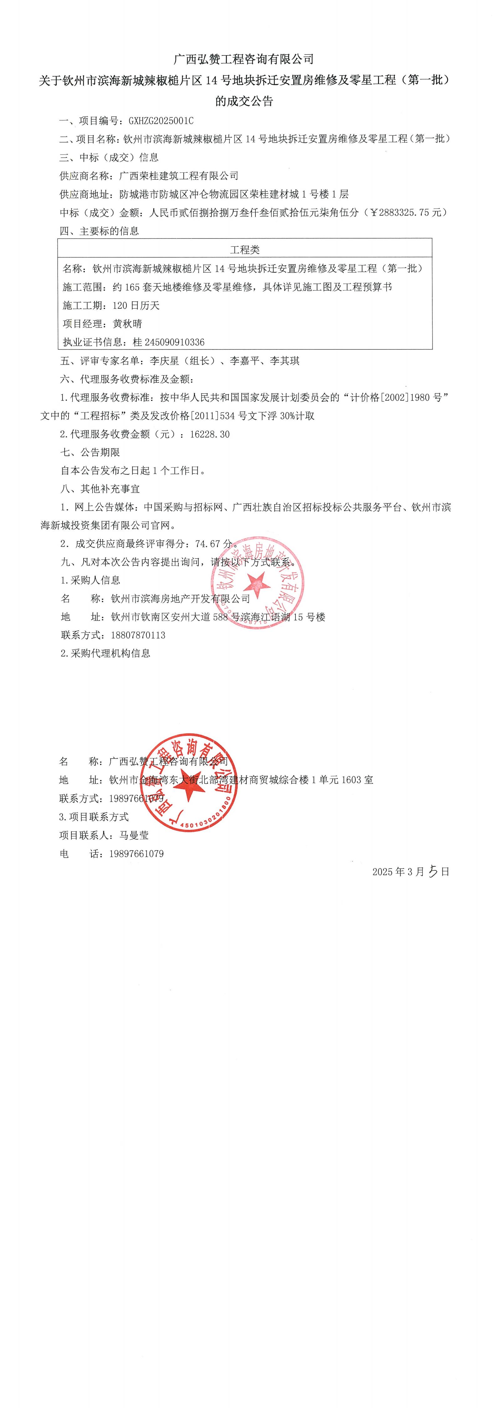 關(guān)于欽州市濱海新城辣椒槌片區(qū)14號(hào)地塊拆遷安置房維修及零星工程(第一批)的成交公告