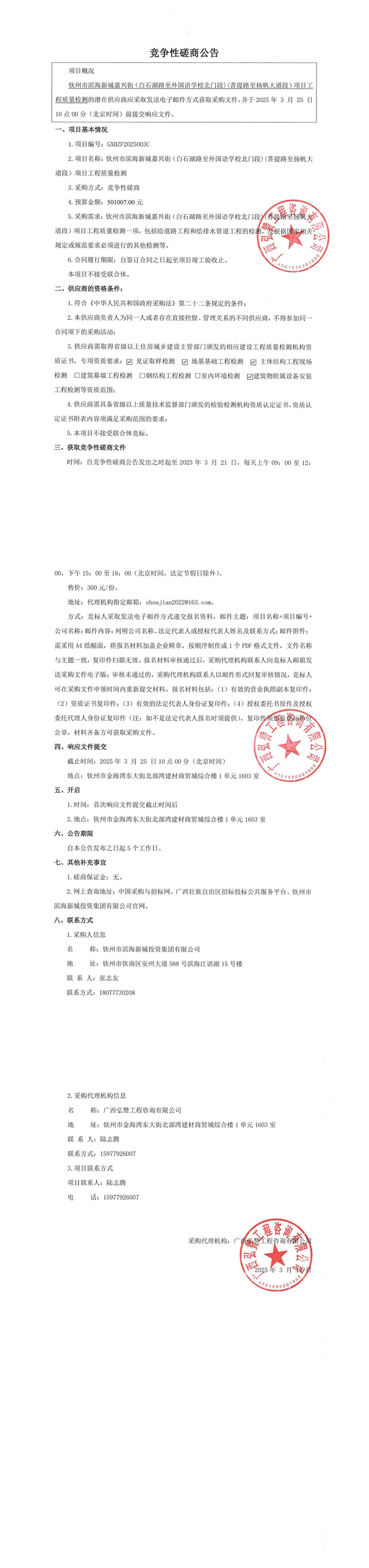 競(jìng)爭(zhēng)性磋商公告-欽州市濱海新城嘉興街(白石湖路至外國(guó)語學(xué)校北門段)(菩提路至揚(yáng)帆大道段)項(xiàng)自工程質(zhì)量檢測(cè)