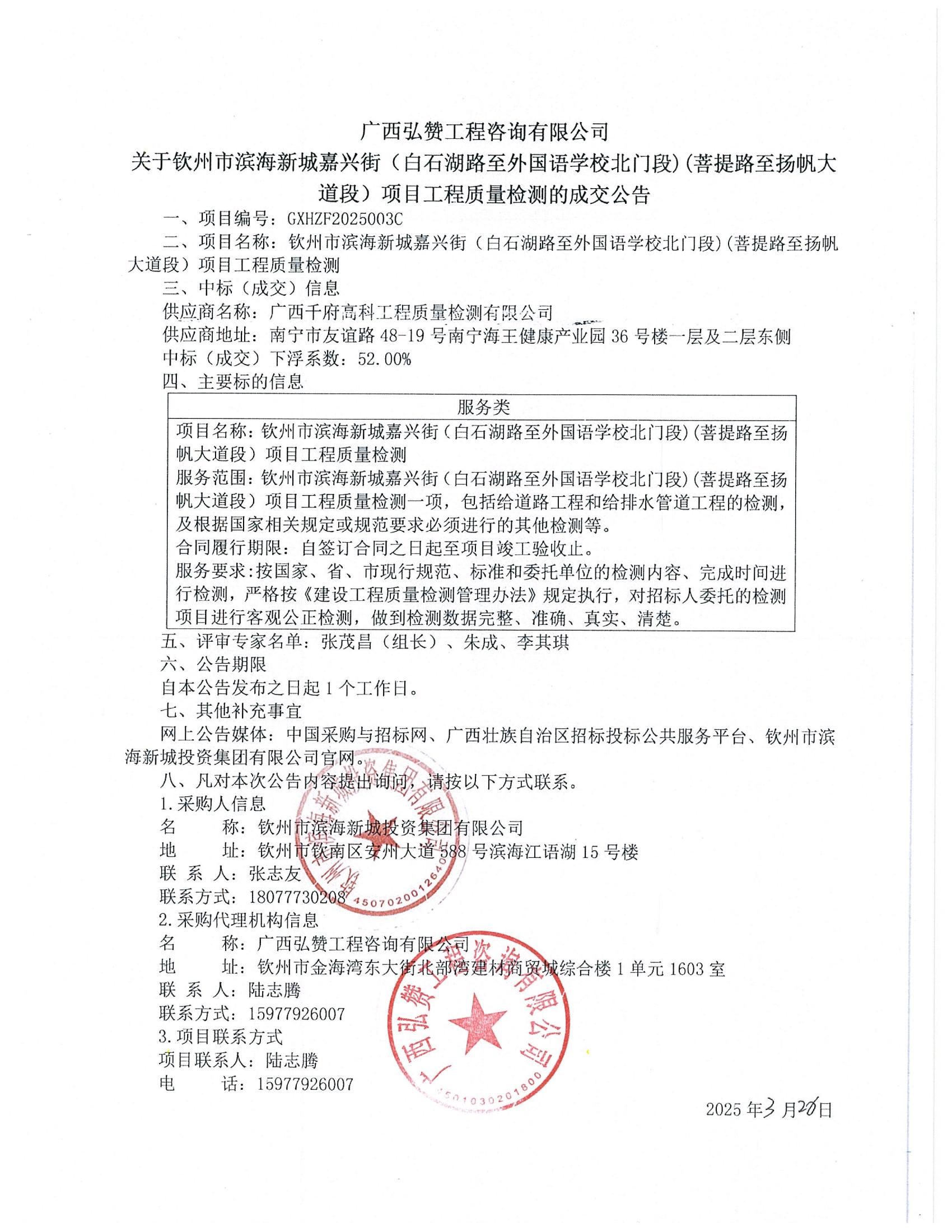 欽州市濱海新城嘉興街(白石湖路至外國(guó)語學(xué)校北門段)(菩提路至揚(yáng)帆大道段)項(xiàng)目工程質(zhì)量檢測(cè)的成交公告