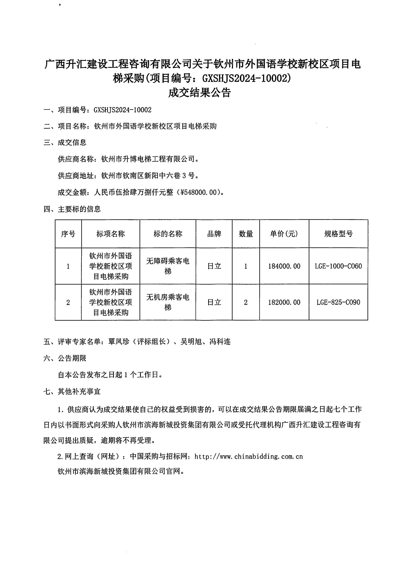 廣西升匯建設(shè)工程咨詢有限公司關(guān)于欽州市外國語學(xué)校新校區(qū)電梯采購成交結(jié)果公告