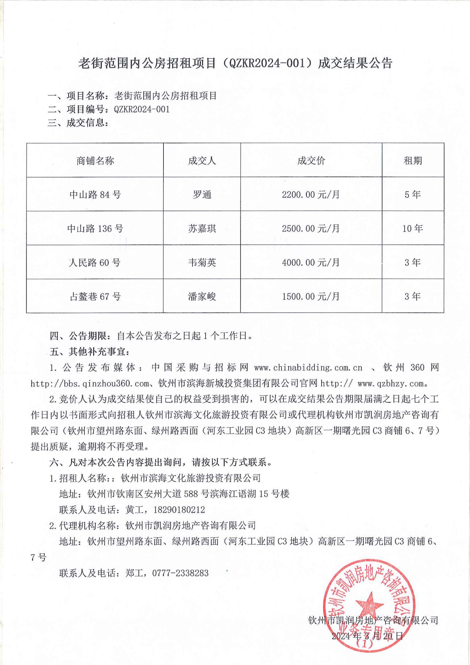 老街范圍內公房招租項目(QZKR2024-001)成交結果公告