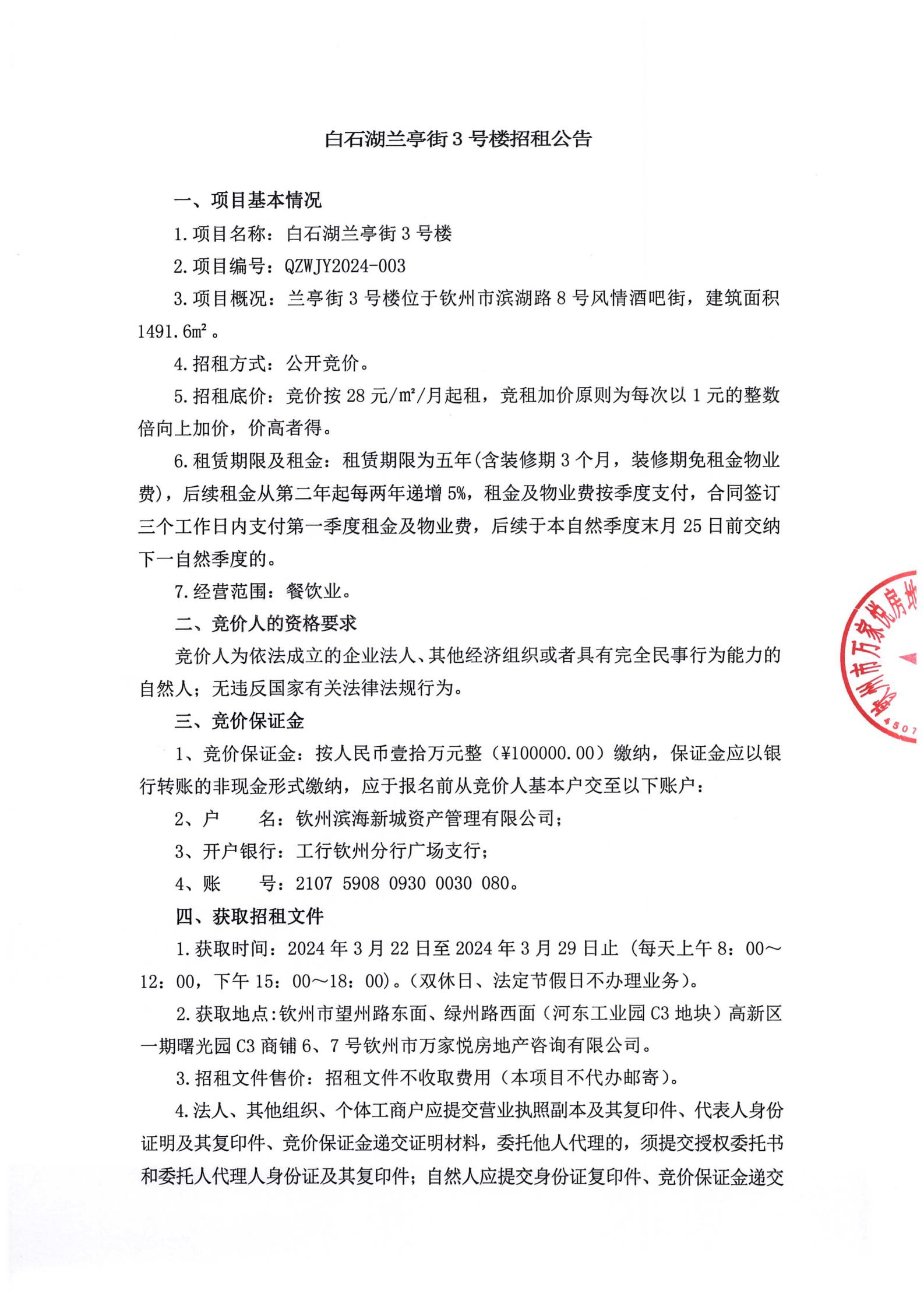 白石湖蘭亭街3號樓(QZWJY2024-003)成交結果公告