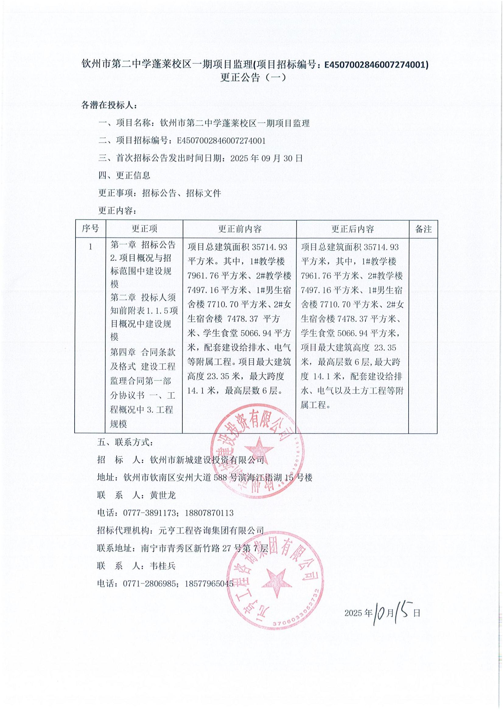 欽州市第二中學蓬萊校區(qū)一期項目監(jiān)理(項目招標編號:E4507002846007274001)更正公告(一)