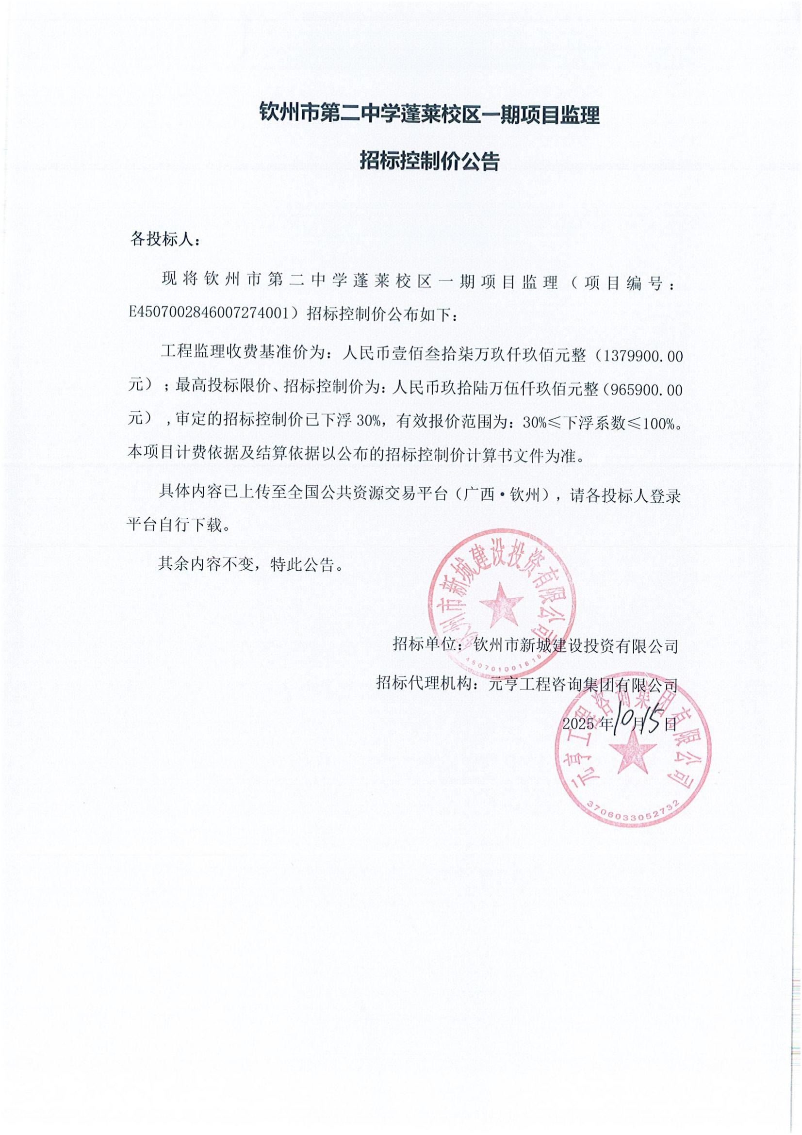 欽州市第二中學蓬萊校區(qū)一期項目監(jiān)理招標控制價公告