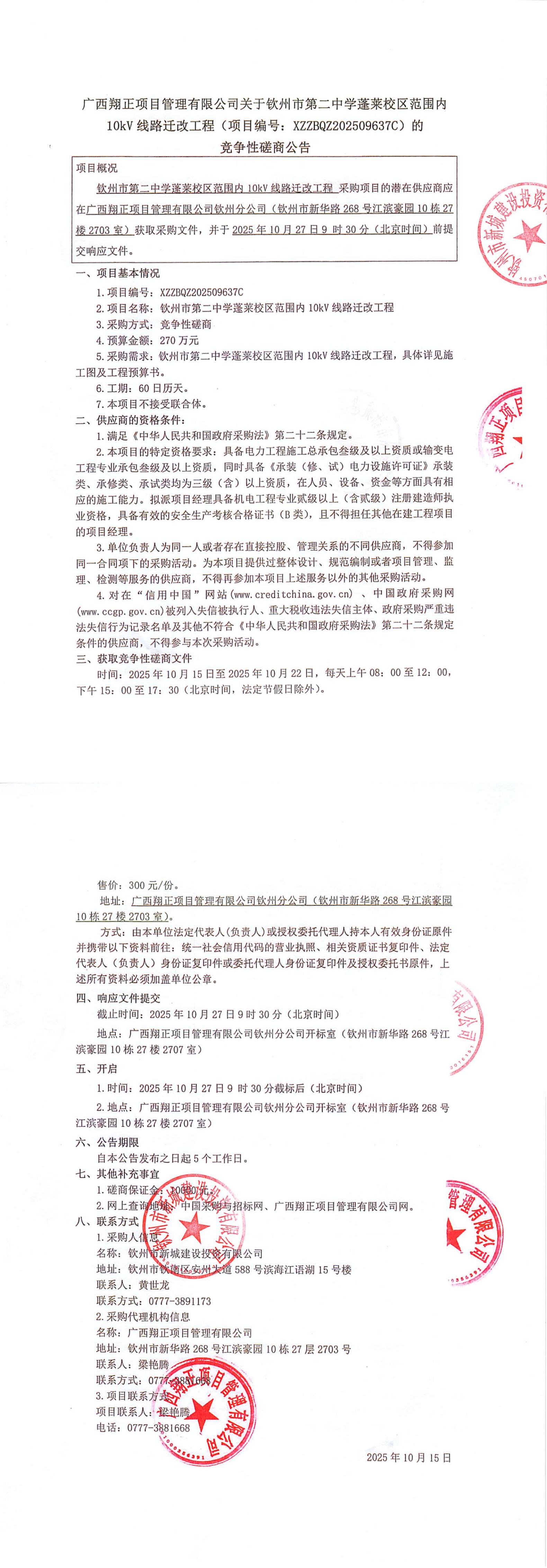 廣西翔正項目管理有限公司關(guān)于欽州市第二中學蓬萊校區(qū)范圍內(nèi)10kV線路遷改工程(項目編號:XZZBQZ202509637C)的競爭性磋商公告