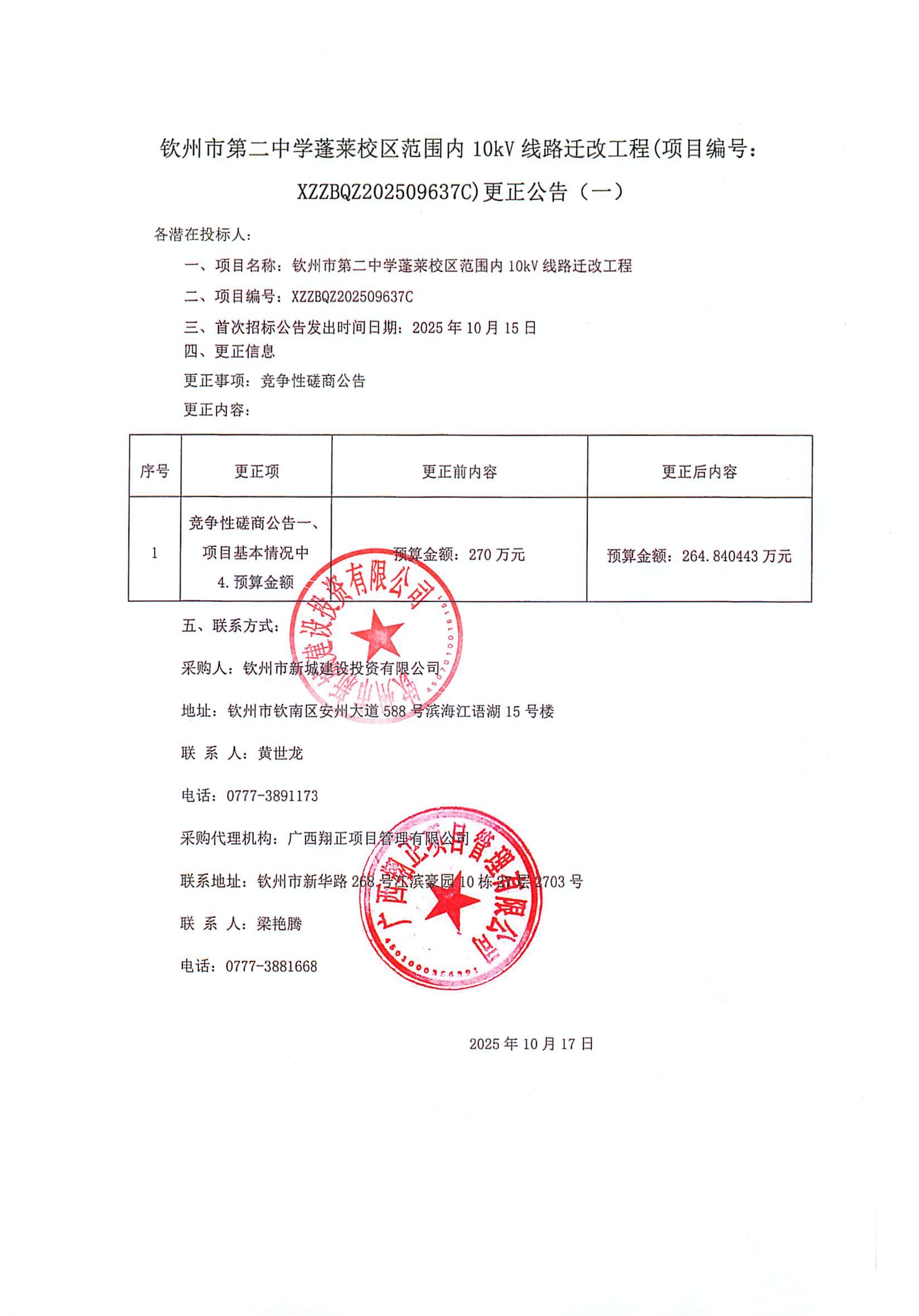 欽州市第二中學蓬萊校區(qū)范圍內(nèi)10kV線路遷改工程(項目編號: XZZBQZ202509637C)更正公告(一)