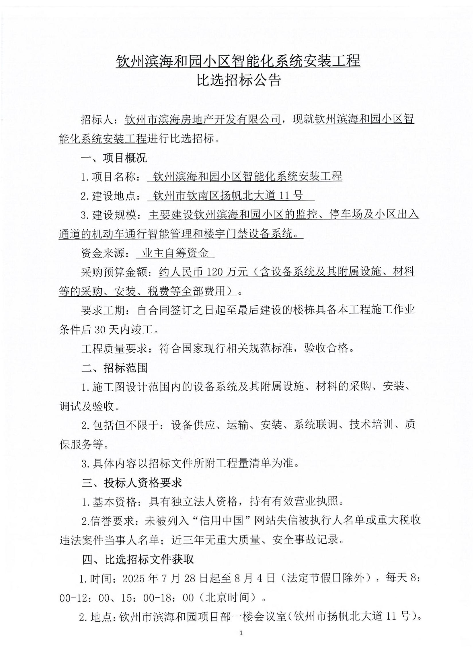 欽州濱海和園小區(qū)智能化系統(tǒng)安裝工程比選招標公告