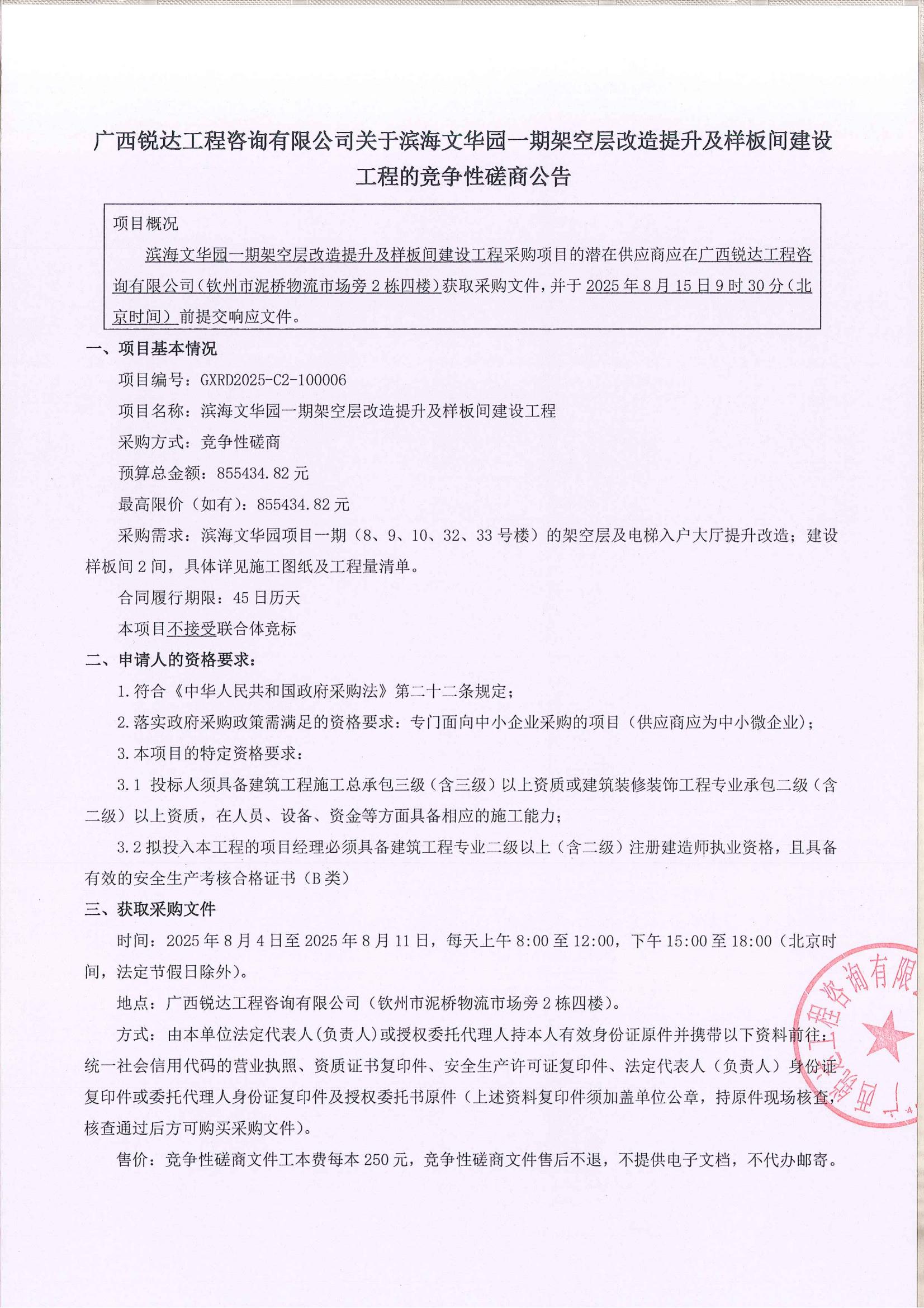 廣西銳達工程咨詢有限公司關(guān)于濱海文華園一期架空層改造提升及樣板間建設工程的競爭性磋商公告
