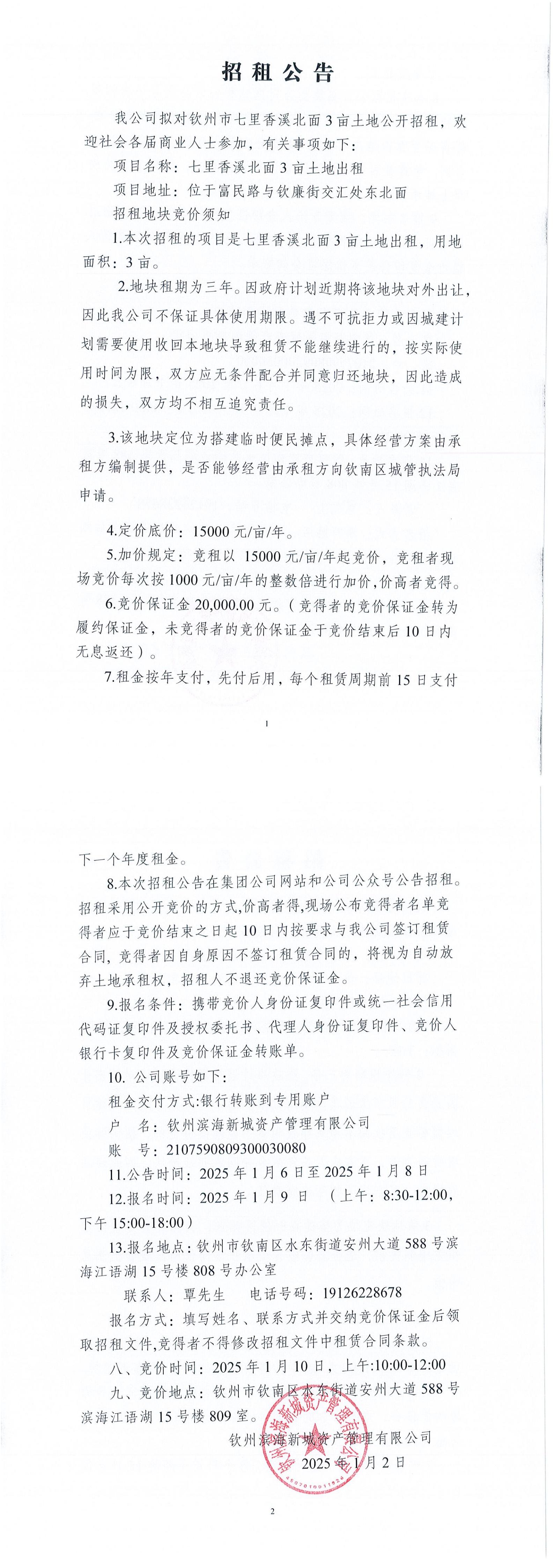 欽州市欽南區(qū)祥安路西側(cè)土地公開招租項(xiàng)目成交確認(rèn)書