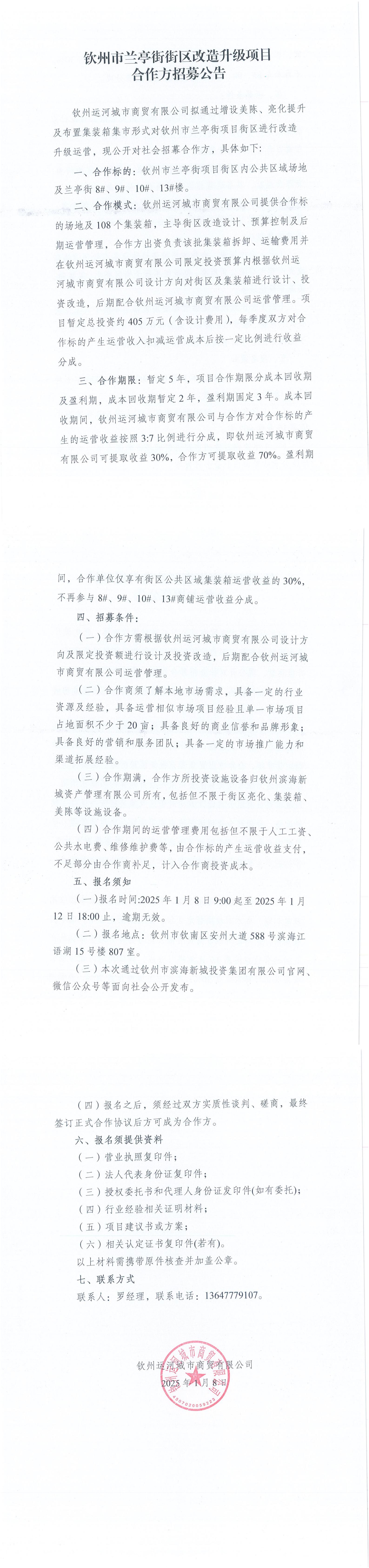 欽州市蘭亭街街區(qū)改造升級項(xiàng)目合作方招募公告