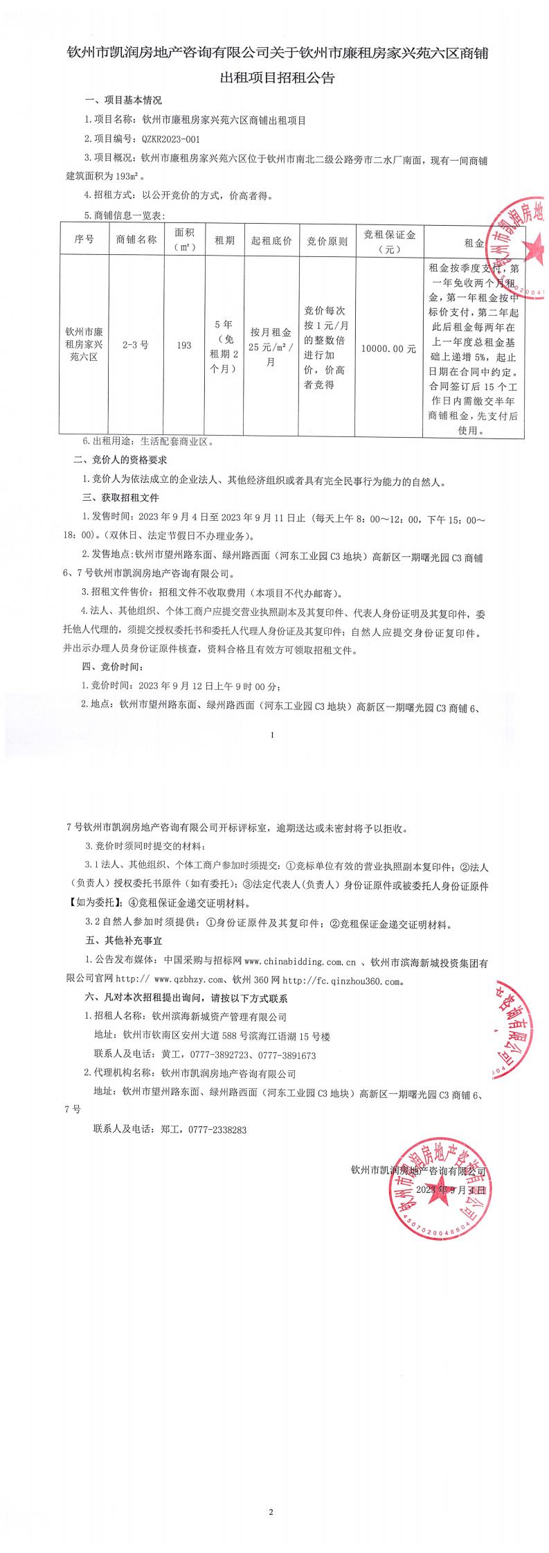 欽州市廉租房家興苑六區(qū)商鋪出租項(xiàng)目招租公告
