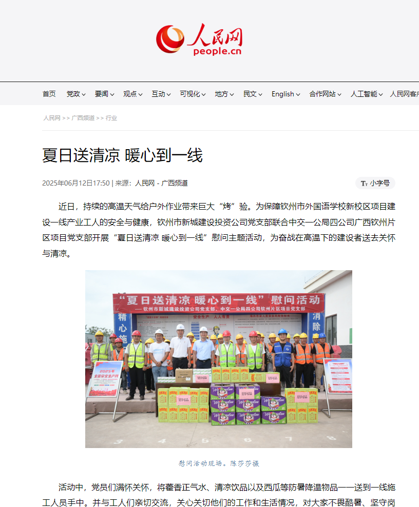 近日,持續(xù)的高溫天氣給戶外作業(yè)帶來巨大“烤”驗。為保障欽州市外國語學(xué)校新校區(qū)項目建設(shè)一線產(chǎn)業(yè)工人的安全與健康,欽州市新城建設(shè)投資公司黨支部聯(lián)合中交一公局四公司廣西欽州片區(qū)項目黨支部開展“夏日送清涼 暖心到一線”慰問主題活動,為奮戰(zhàn)在高溫下的建設(shè)者送去關(guān)懷與清涼。