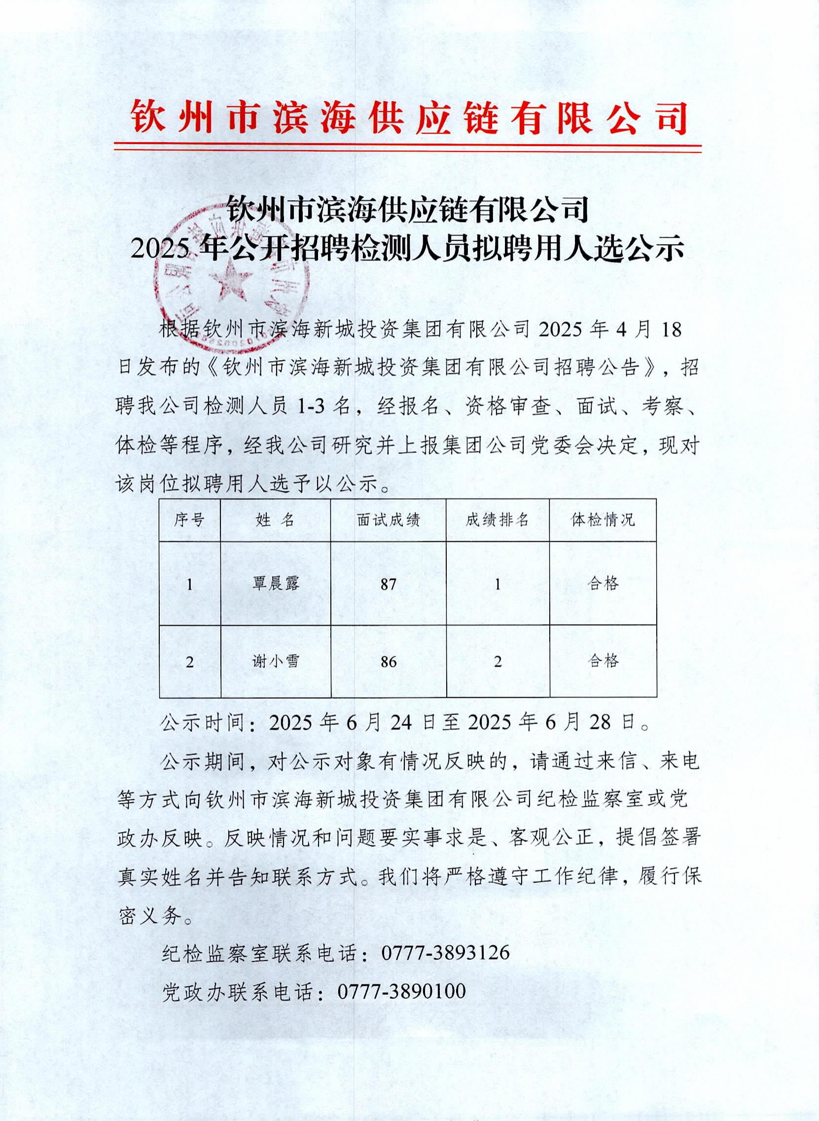 欽州市濱海供應(yīng)鏈有限公司2025 年公開(kāi)招聘檢測(cè)人員擬聘用人選公示