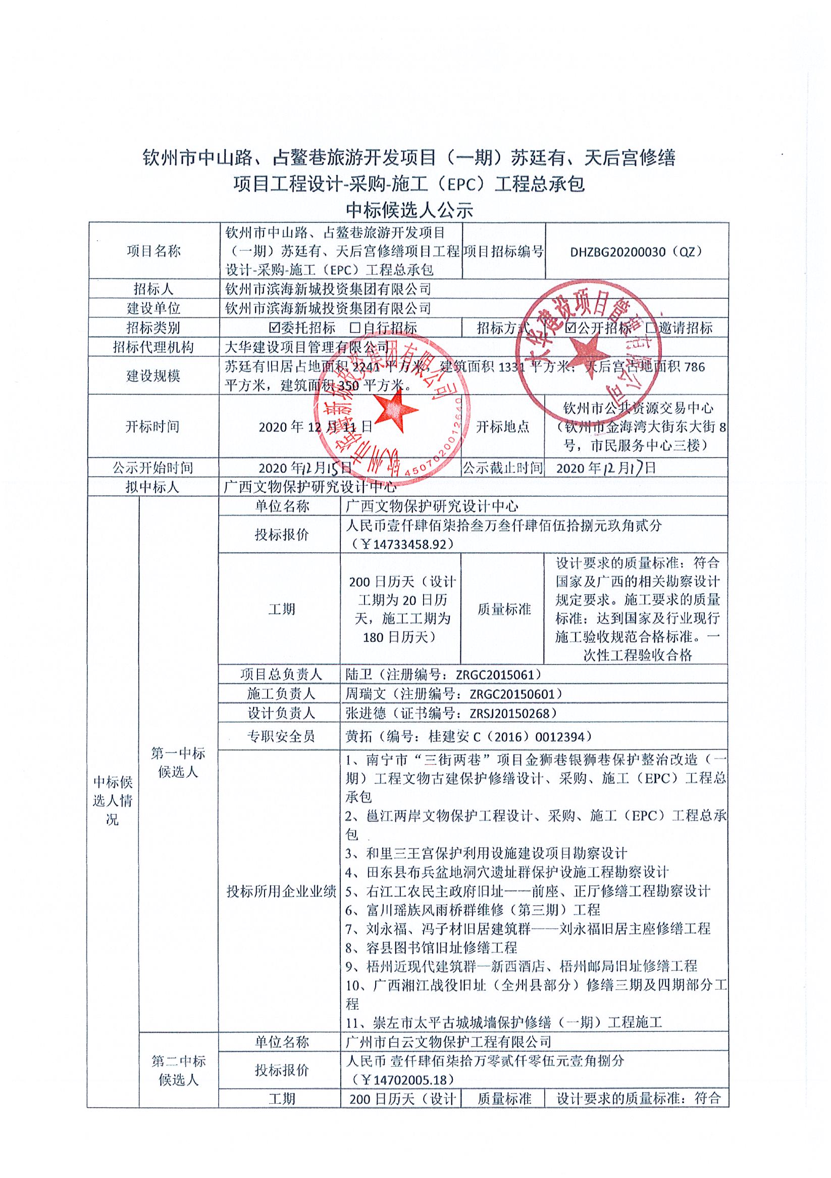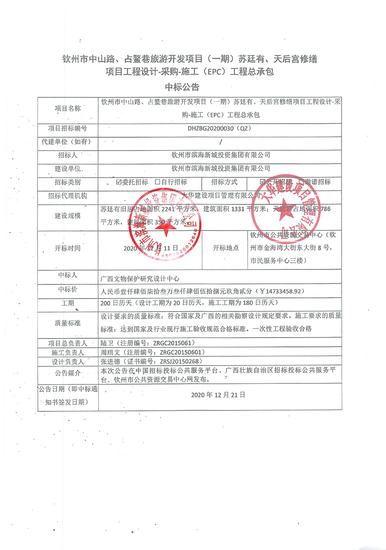 中標(biāo)公示-欽州市中山路、占鰲巷旅游開(kāi)發(fā)項(xiàng)目(一期)蘇廷有、天后宮修繕項(xiàng)目工程設(shè)計(jì)-采購(gòu)-施工(EPC)工程總承包中標(biāo)公告