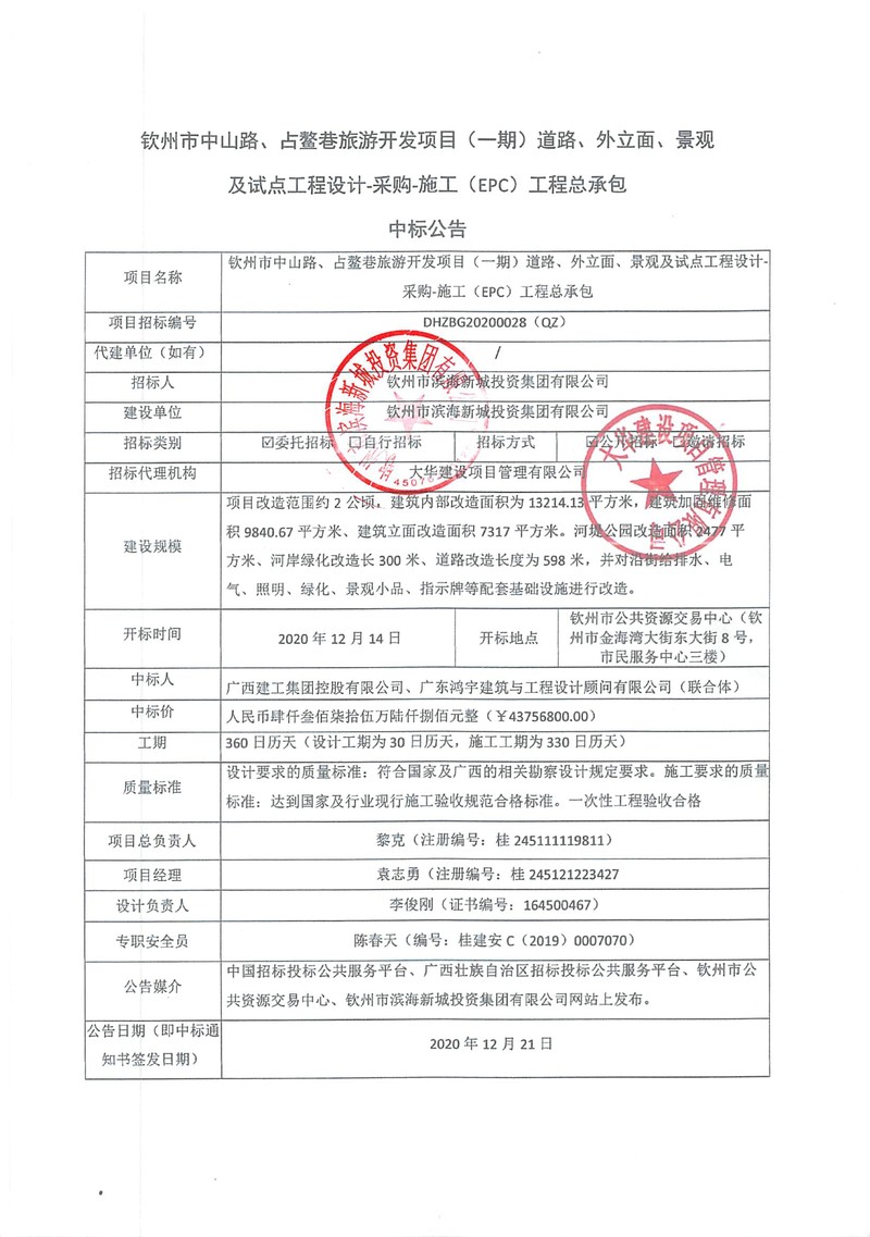 中標(biāo)公示-欽州市中山路、占鰲巷旅游開(kāi)發(fā)項(xiàng)目(一期)道路、外立面、景觀及試點(diǎn)工程設(shè)計(jì)-采購(gòu)-施工(EPC)工程總承包中標(biāo)公告