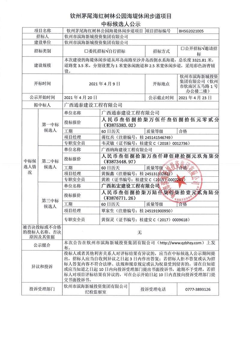 欽州茅尾海紅樹(shù)林公園海堤休閑步道項(xiàng)目候選人公示