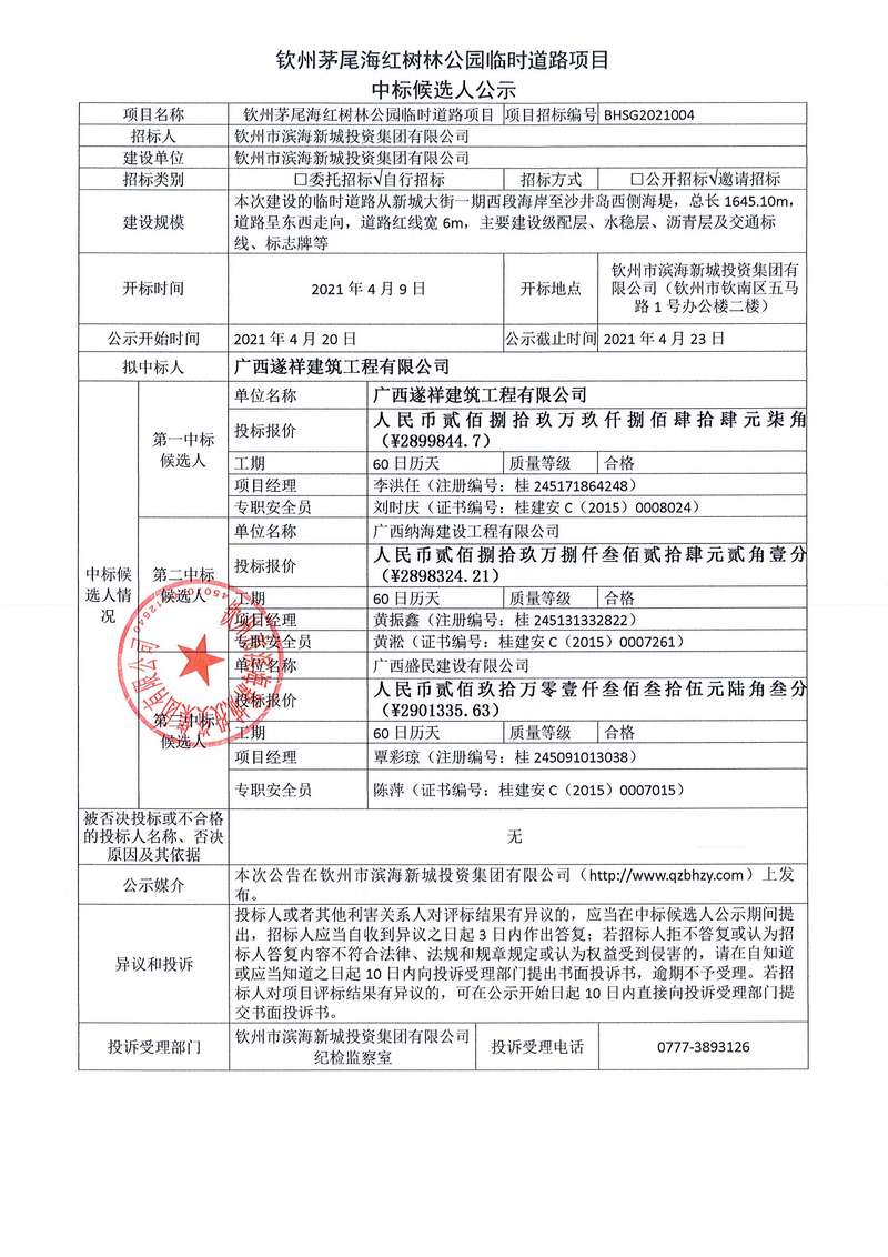 欽州茅尾海紅樹(shù)林公園臨時(shí)道路項(xiàng)目候選人公示